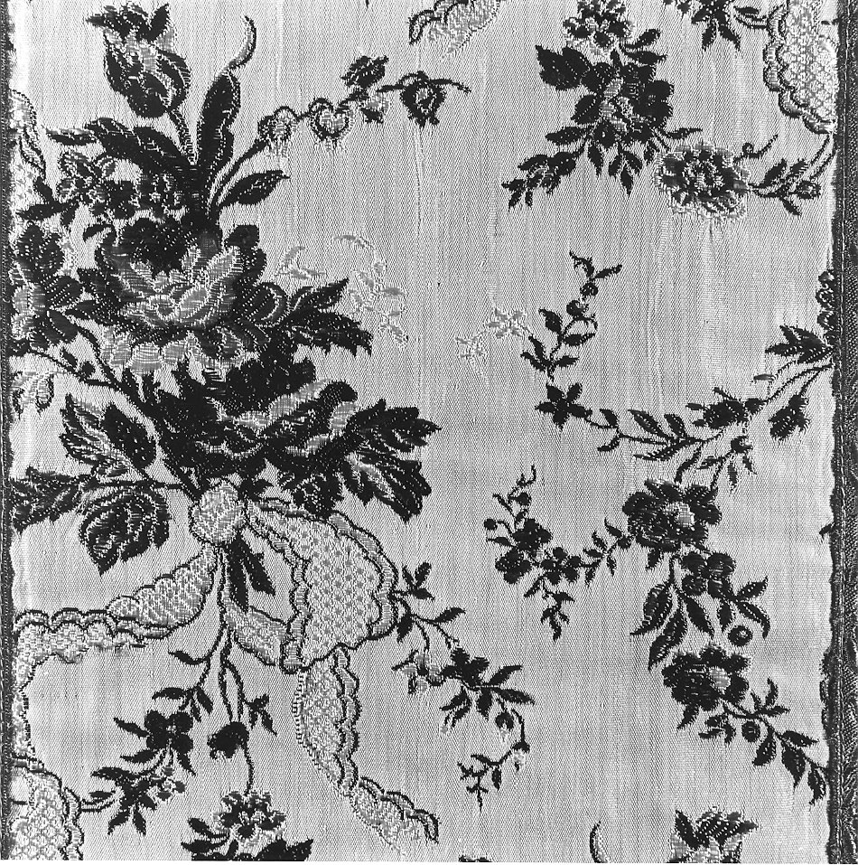 - NOTIZIE STORICO CRITICHE L'impostazione del disegno, che risalta secondo un modello che nel Settecento viene definito "a pointre" stabilisce come tale soluzione sia consona all'arredamento e all'uso liturgico, mentre viene giudicata inadatta e monotona per gli abiti. Notiamo comunque come i rami floreali vengano sottolineati nel loro andamento ondulante dal raffinato disegno geometrico dei nastri "a pizzo" che non mancano mai di figurare nelle vesti femminili, secondo una moda in voga a partire dal regno di Luigi XV (1715-1774). Il caratteristico "nodo d'amore", motivo di largo successo, è tipico dei tessuti detti alla "Maria Leszczyuska" moglie di Luigi XVI