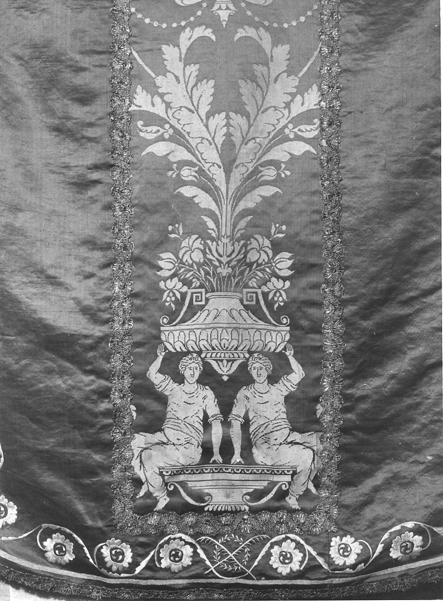 Il paramento si compone di una pianeta, una stola e un velo. Disegno: lungo i bordi rami fioriti ad andamento ondulante. All'interno dello stolone della pianeta due figure di giovinetti speculari seduti su un vaso di gusto neoclassico e reggenti un'anfora con anse desinenti a greca da cui fuoriescono mazzi di fiori e palme che, ampliandosi si allungano verticalmente. Nella parte superiore dello stolone volute elegantemente stilizzate. Il velo presenta altri motivi di gusto neoclassico tagliati ai bordi: negli angoli superiori due chimere speculari, al centro in basso, entro una cornice, due figure con toga affrontate dell'atto di ornare con ghirlanda un'ara. Volute e palme, mascheroni e conchiglie completano il disegno. Colori: sul fondo rosso si stagliano le figure in bianco. Tessuto: rosso faccia catena per il fondo, bianco faccia trama per il disegno. Trina in argento lamellare e riccio. Fodera un rasatello marezzato rosso, fodera di seta rossa nel manipolo