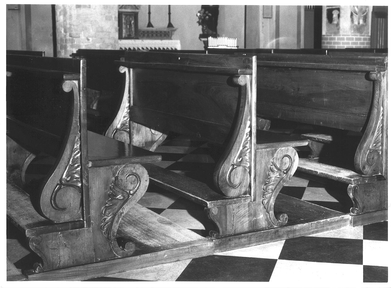 Banco da chiesa su pedana, con sedile liscio poggiante su sostegni a voluta fogliacea. Elementi analogamente intagliati definiscono anche gli inginocchiatoi a predella posti sul retro di ciscun arredo