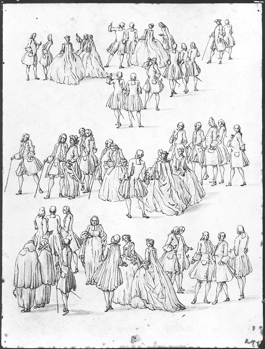 Penna e acquerello seppia su carta bianca. Al centro un dignitario turco è accompagnato da gentiluomini e dame; in basso si formano quattro gruppi intorno a un prelato; in alto un gentiluomo sta guardando con una sorta di binocolo verso l'alto