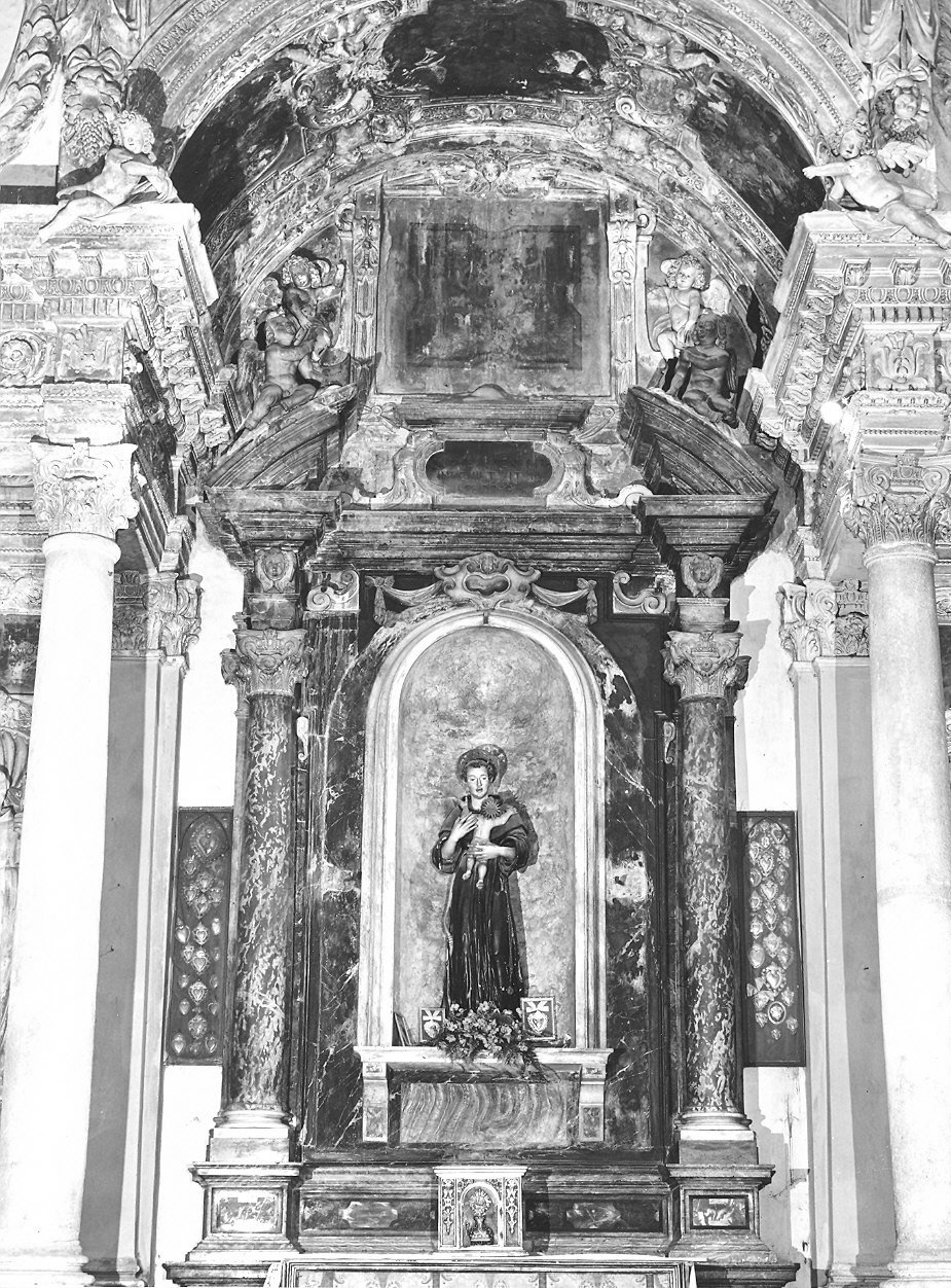 - NOTIZIE STORICO CRITICHE Come ricorda l'Emmanueli "L'altare propriamente detto però, tutto di marmo... compreso il nicchio... fu eretto più tardi, ex voto di certi Bartolomeo Boselli guarito improvvisamente da enterite.. L'arme del benefattore che presenta il simbolo del suo nome si vede scolpita nello zoccolo dell'altare da ambo i lati". Fu anch'esso, come la cappella, a lungo in predicato di soppressione: in una seduta dell'Opera Parrocchiale del 7/08/1822 si stabilisce che "il nicchio di S. Antonio sia messo a fil di muro secondo l'invito podestarile", spiccato in relazione alla sistemazione di una delle botteghe orafe sottostanti la nicchia stessa. L'opera Parrocchiale aveva aderito alla richiesta chiedendo in cambio al Comune di restaurare a sue spese il quadro da porre sull'altare, una volta ridotta la nicchia a fil di muro, ma evidentemente non si procedette. La documentazione ne identifica l'autore in Gian Battista Muttoni, scultore originario dil Laino, che lo realizzò tra 1660 e 1662 (cfr. Fiori 1995)