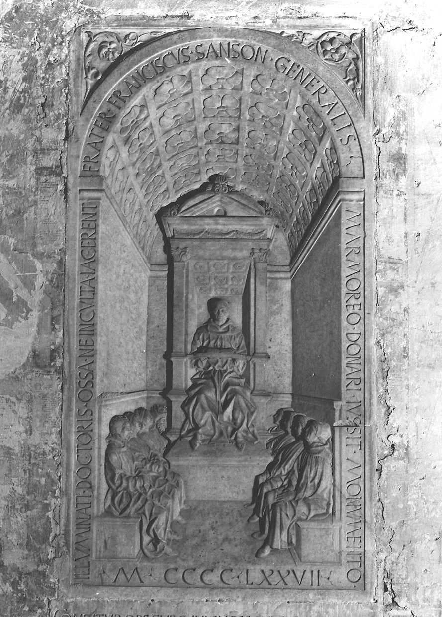 - ISCRIZIONI lungo la cornice esterna - ILLUMINAI . DOCTORIS . OSSA . NE . INCULTA . IACERENT . FRATER . FRANCISCUS . SANSON . GENERALIS . MARMOREO . DONARI . IUSSIT . MUNUMENTO . M.CCCC.LXXVII - lettere capitali - a incisione -
