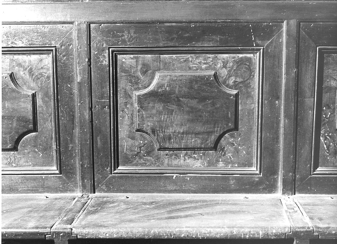 - NOTIZIE STORICO CRITICHE La fronte dell'inginocchiatoio presenta la cornice a tarsia scolorita per un tentativo di restauro mal riuscito. Alcuni sedili hanno tavole sconnesse; per il discreto interesse artistico, dato dalla presentazione di moduli stilistici rinascimentali, si propende per il restauro