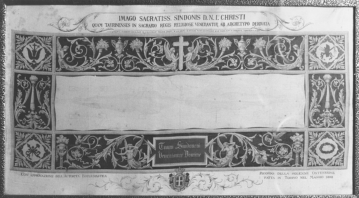 - NOTIZIE STORICO CRITICHE Il tessuto è stato stampato, con approvazione dell'autorità ecclesistica, a ricordo della ostensione della Sindone fatta a Torino nel 1898 (come si legge nella scritta in basso). Il lavoro, genericamente assegnabile a manifattura italiana, ripropone, secondo il gusto del recupero degli stili storici, proprio della fine del secolo XIX, un tipo di ornamento, la grottesca, diffuso nel Rinascimento