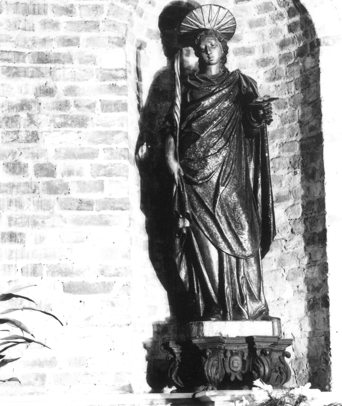 - NOTIZIE STORICO CRITICHE Elegante la posa della Santa, bloccata in una maestà architettonica dal pesante panneggio delle vesti; il viso ovale, pensoso ed assorto, ne aumenta la dignità. Risale probabilmente alla metà del '500. Il panneggio sulla spalla lascia pensare che sia opera rinascimentale. Si notino le caratteristiche della scuola locale di cultura ancora legata, prima del ritorno da Roma di Giulio Mazzoni, ai modi lombardi dell'Amadeo e del Mantegazza