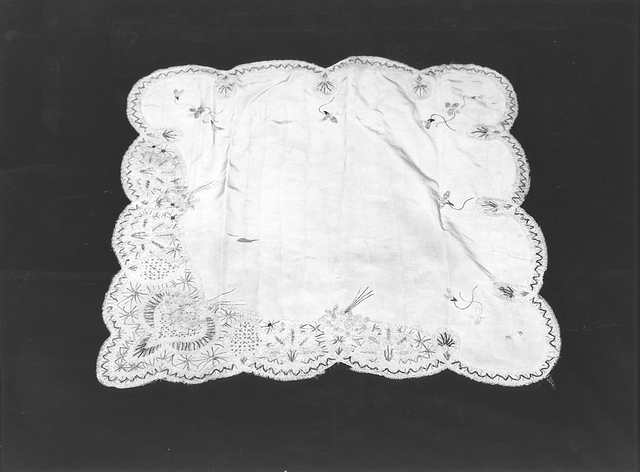 - NOTIZIE STORICO CRITICHE L'originale disposizione del motivo decorativo, circoscritto ad un solo angolo del velo, con piccoli fiori distribuiti simmetricamente in corrispondenza delle anse degli smerli lungo i margini, nonchè l'estrema schematizzazione dei motivi naturalistici che sembrano risentire l'influenza delle stilizzazioni metamorfiche divulgate dal liberty, consigliano una datazione compresa fra la fine del sec. XIX e l'inizio del secolo successivo