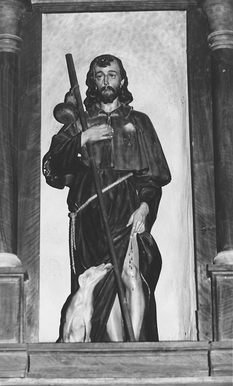 Statua in stucco policromo di S. Rocco, risolta secondo l'iconografia tradizionale, con il santo raffigurato in età matura con segni evidenti della peste nella piaga sanguinante della gamba sinistra, avvolto in un ampio mantello verde scuro da pellegrino, ornato di attributi simbolici (la conchiglia e la croce patente), con il tipico bordone corredato dell'ampolla di pellegrinaggio nella destra ed ai piedi il fedele cane che gli portò il cibo durante la peste