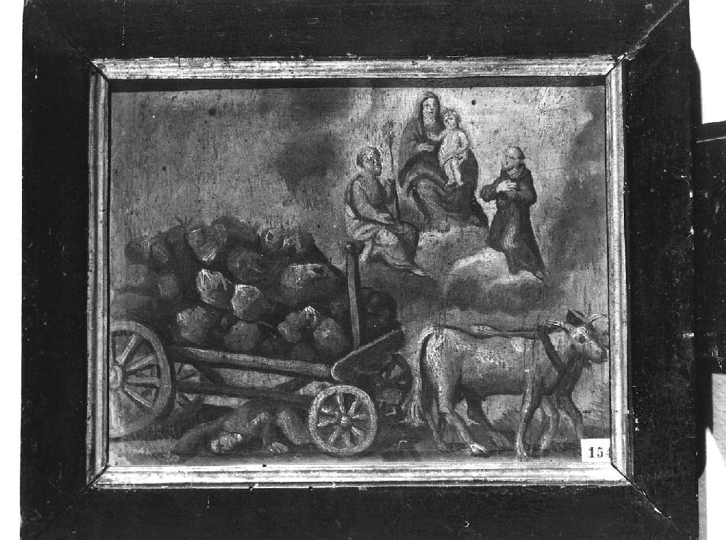 La scena rappresenta un uomo che giace a terra essendo stato investito daun carro trainato da buoi, mentre in alto, circondata da nubi, appare la Madonna del Carmelo affiancata da S. Giuseppe e S. Francesco d'Assisi
