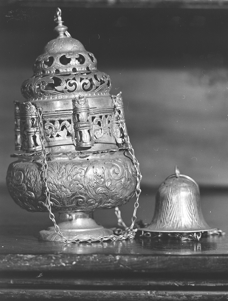 L'orlo del piede è decorato da un motivo a ghirlanda con nastri intrecciati. La coppa espansa è decorata con volute d'acanto e termina con un orlo a piccoli petali. La parte inferiore del coperchio è traforata a giorno, per l'esalazione dell'incenso; vi sono applicate sei colonnette composte da due motivi vegetali sovrapposti, separati da una modanatura e culminanti con cherubini; tre di esse fungono da passanti per le catene di sospensione. La cuspide del coperchio si assottiglia con una serie di modanature ed è traforata con motivi vegetali. L'impugnatura a campana presenta un motivo di ampie foglie lanceolate e venate
