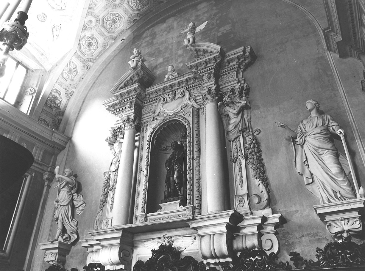 Colonne con capitelli corinzi sorreggono una trabeazione mossa e riccamente decorata, alla cui sommità sono due putti e al centro la Vergine Maria a mezzo busto. Al centro è la nicchia del Santo con ampia conchiglia all'interno; cartiglio ovoidale con putto al centro. Sui lati esterni, due angeli telamoni sorreggono i capitelli corinzi; festoni di fiori e frutti dipinti in verde e rosa pallido