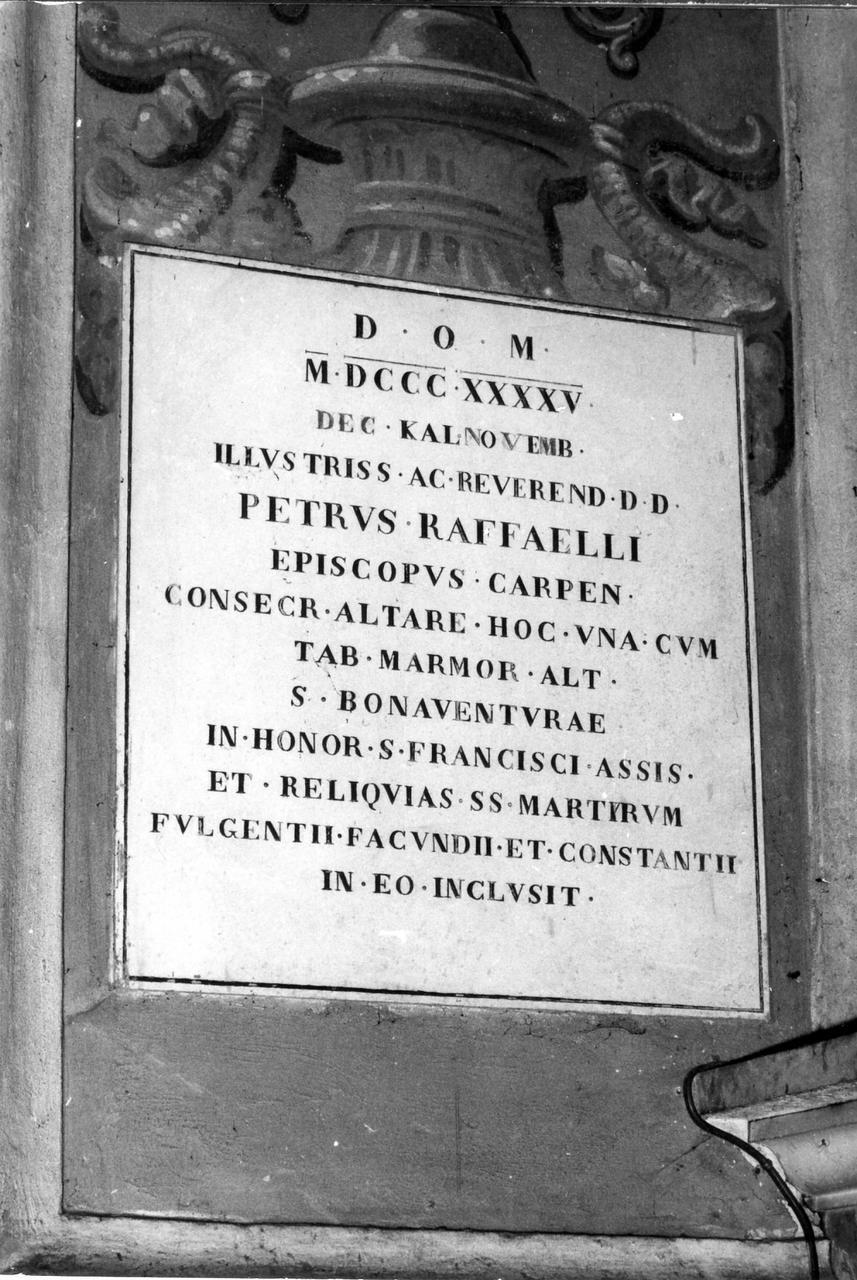 - ISCRIZIONI occupa l'intera lapide - D(eo). O(ptimo). M(aximo)./ M. DCCC. XXXV/ DEC(---). KAL(---). NOVEMB(---)./ ILLUSTRISSIM(---). AC REVEREND(---). D(---). D(---)./ PETRUS. RAFFAELLI/ EPISCOPUS. CARPEN(---)./ CONSECR(---). ALTARE. HOC. UNA. CVM/ TAB(---). MARMOR(---). ALT(---)./ S(ANCTO). BONAVENTVRAE/ IN. HONOR. S(ANCTO). FRANCISCI ASSIS(---)./ ET RELIQUIAS SS(---). MARTIRVM/ FULGENTII. FACUNDII. ET. COSTANTII/ IN. EO. INCLVSIT - lettere capitali - a pennello - latino volgare