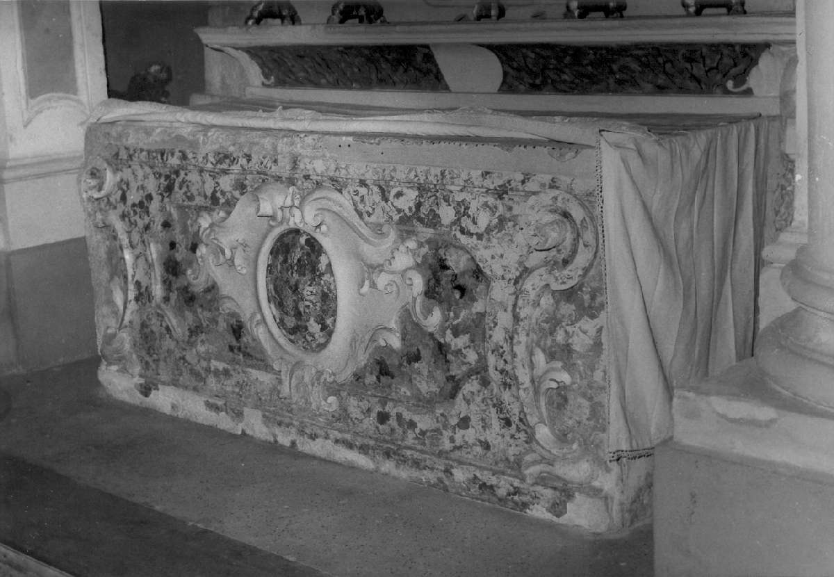 Decorazione plastica in scagliola a bassorilievo, nella zona centrale e ai lati del paliotto: cartigli spezzati, a cartoccio e volute includono una cartella liscia. La scagliola usata nel paliotto imita diversi tipi di marmi brecciati nelle tonalità gialle, rosate e grigie