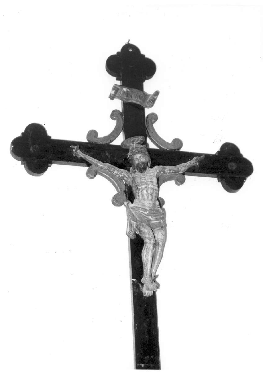 La croce è dipinta di scuro con ornati a giorno nella traversa e terminazioni polilobate. Il Cristo è intagliato a tutto tondo e policromato