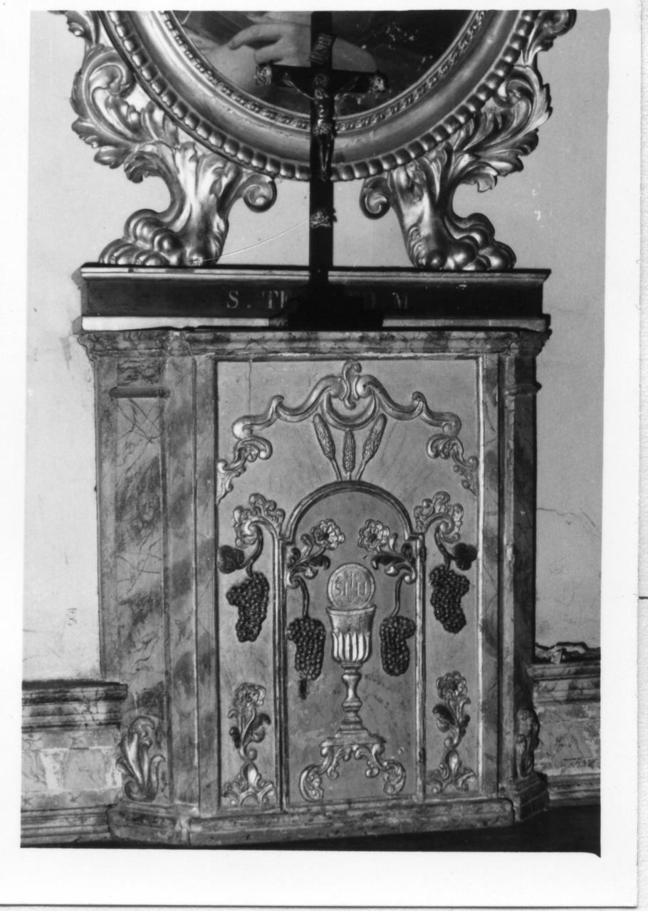Legno intagliato, dipinto a finto marmo nei toni rosati; sportello centinato verde, con intagli a bassorilievo schiacciato, policromo e dorato, raffiguranti racemi, grappoli d'uva e un calice con l'ostia