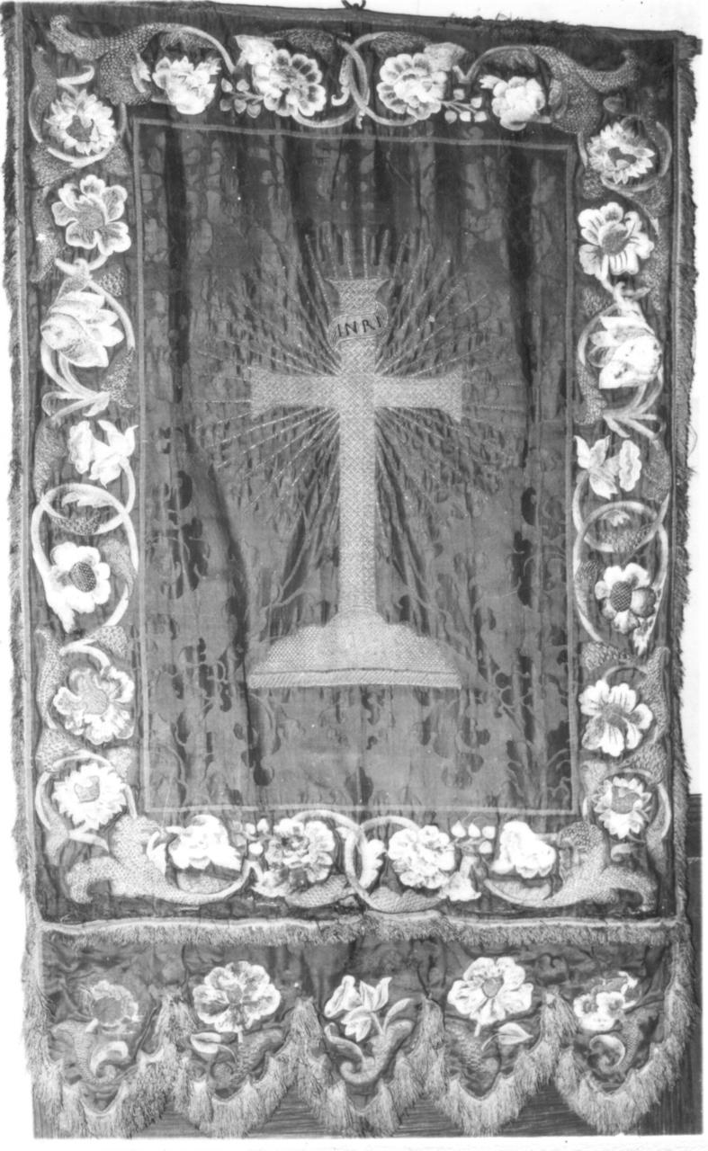 Entro una ricca cornice floreale che scorre lungo i bordi è rappresentata la croce, simbolo della passione di Cristo. Fondo rosso: disegno oro e policromo. Damasco ricamato. Fondo: damasco. Disegno: ricamo in seta a punto piatto; in oro per applicazione e a rilievo. Frangia in seta nocciola (in origine rossa). Fodera in raso di cotone rosa