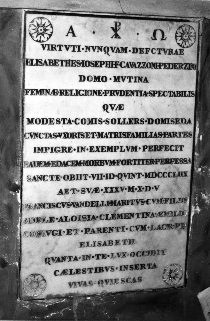 - ISCRIZIONI occupa l'intera lastra - VIRTUTI. NUNQUAM. DEFCTURAE/ ELISABETHES. IOSEPHI. CAVAZZONI. PEDERZINI/ DOMO. MUTINA/ FEMINAE. RELIGIONE. PRUDENTIA. SPECTABILIS/ QUAE/ MODESTA. COMIS. SOLLERS. DOMISEDA/ CUNCTAS. UXORISET. MATRISFAMILIAS. PARTES/ IMPIGRE. IN. EXEMPLUM. PERFECIT/ EADEM. EDACEM. MORBUM. FORTITER. PERPESSA/ SANCTE. OBIIT. VII. ID. QUINT. MDCCCLIIX/ AET.SUAE. XXXV. M. X. D. V/ FRANCISCUS. VANDELLI. MARITUS. CUM. FILIIS. ADELS. ALOISIA. CLEMENTINA. AEMILIO/ CONIUGI. ET. PARENT. CUM. LACR. PI/ ELISABETH/ QUANTA. IN. TE. LUX. OCCIDIT/ CAELESTIBUS. INSERTA/ VIVAS. QUIESCAS - lettere capitali - a incisione -