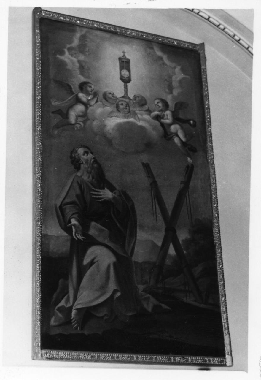 Sant'Andrea, in veste rosata e manto giallo, inginocchiato, contempla la gloria del Santissimo Sacramento espresso in un ostensorio adorato dagli angeli. Nel fondo, oltre la croce simbolo del suo martirio, è un paesaggio montuoso. Semplice cornice di legno dorato