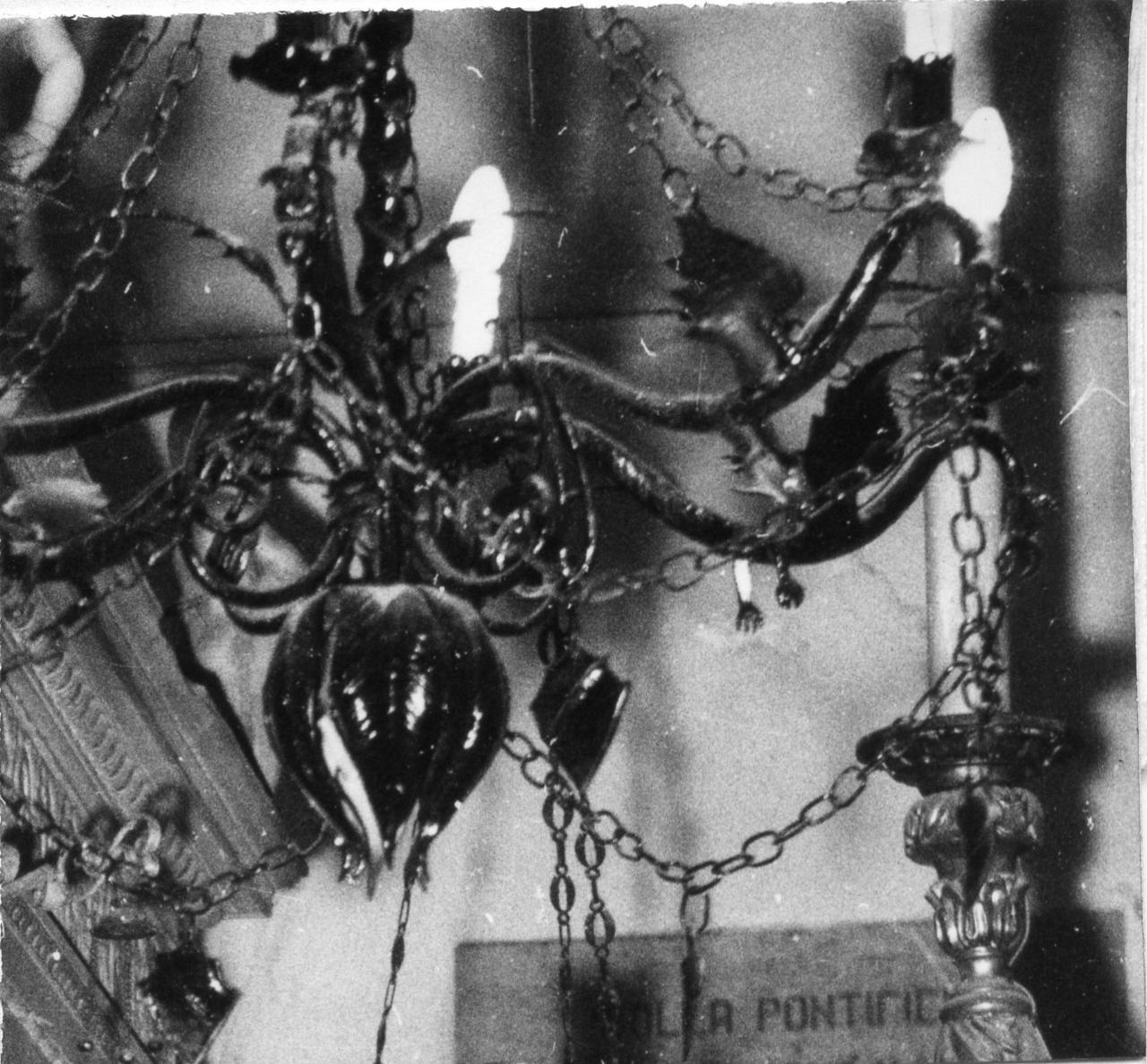 Eseguiti in ferro battuto martellinato. Struttura due bracci arcuati terminanti in lampade e uniti mediante catenelle che reggono croci e medaglie. I bracci si dipartono da un cespo a bacca fogliata