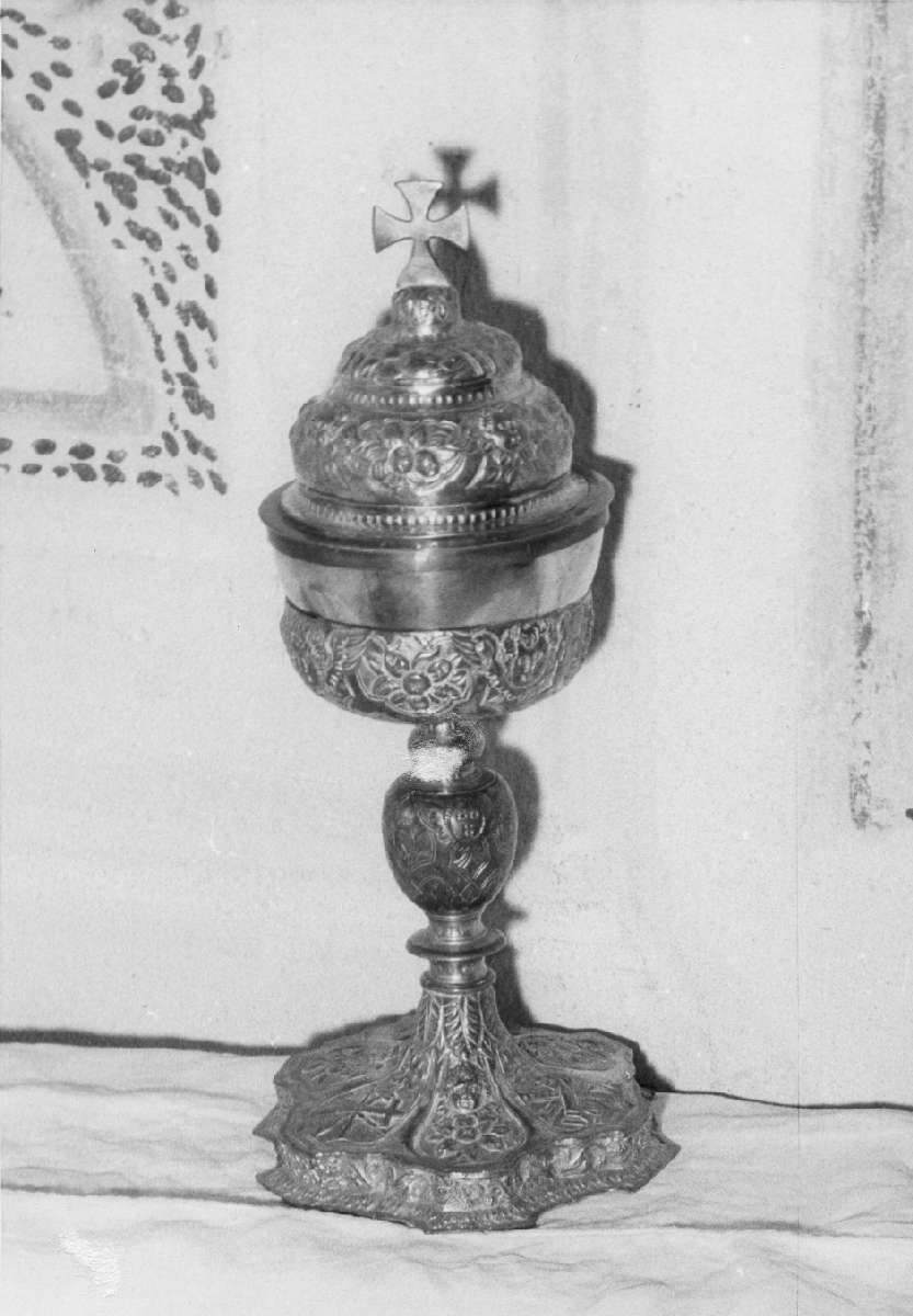 Piede con base mistilinea. La fascia rialzata del piede presenta un ornato a girali vegetali alternati a teste di cherubini e a simboli della passione. Sulla base si sviluppa un motivo a volute giustapposte entro le quali si inseriscono mezze figure di santi. Nodo ovoidale con ornati vegetali. Sottocoppa e coperchio a sbalzo con ornati vegetali. Coppa d'argento