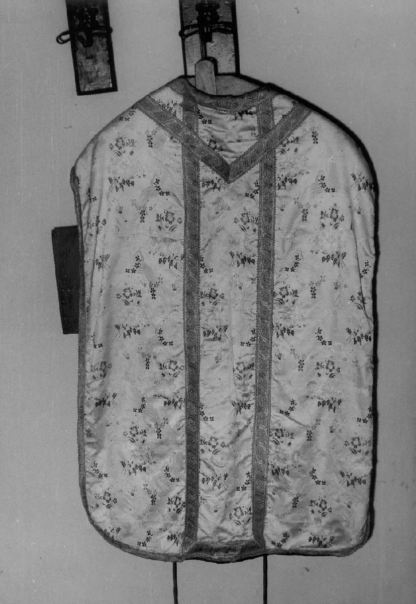 Il parato è costituito da un piviale, una pianeta, due tonacelle, due stole, tre manipoli e una borsa per elemosine. Su un fondo in raso faccia ordito color giallo è descritto un motivo a maglie color perla con entro mazzetti di fiori policromi