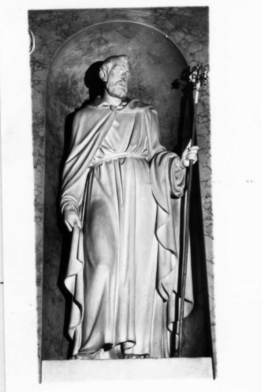 Statua in gesso a tutto tondo, patinata in bianco a finto marmo. San Giuseppe è in piedi, nella sinistra regge il bastone fiorato, la testa leggermente reclinata. Indossa larga tunica e mantello sulle spalle che trattiene con la destra