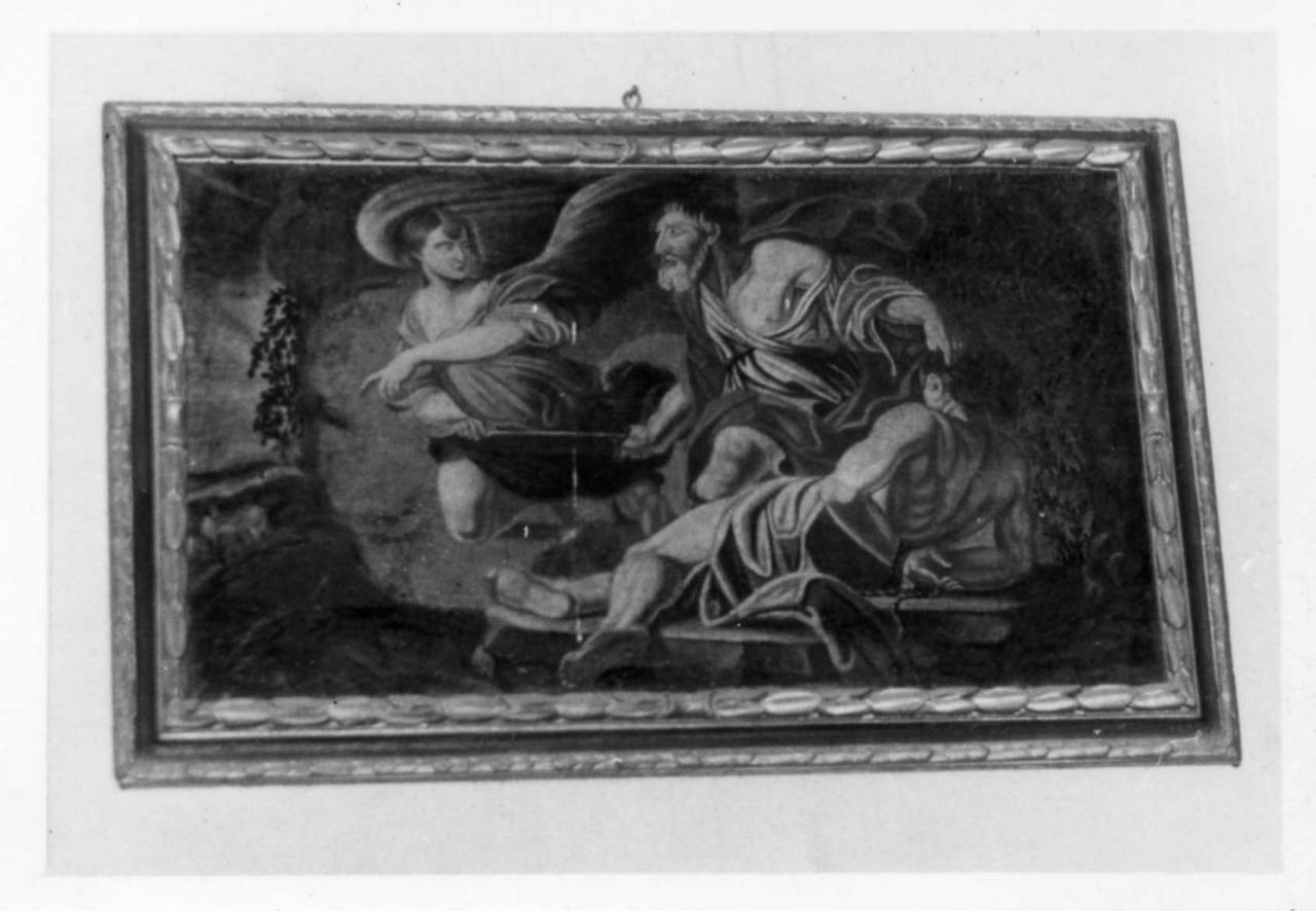 Abramo, in vesti azzurre e brune è fermato dall'Angelo mentre sta per uccidere Isacco, in panni giallastri. Con cornice seicentesca, intagliata a foglie, dipinta di azzurro e dorata