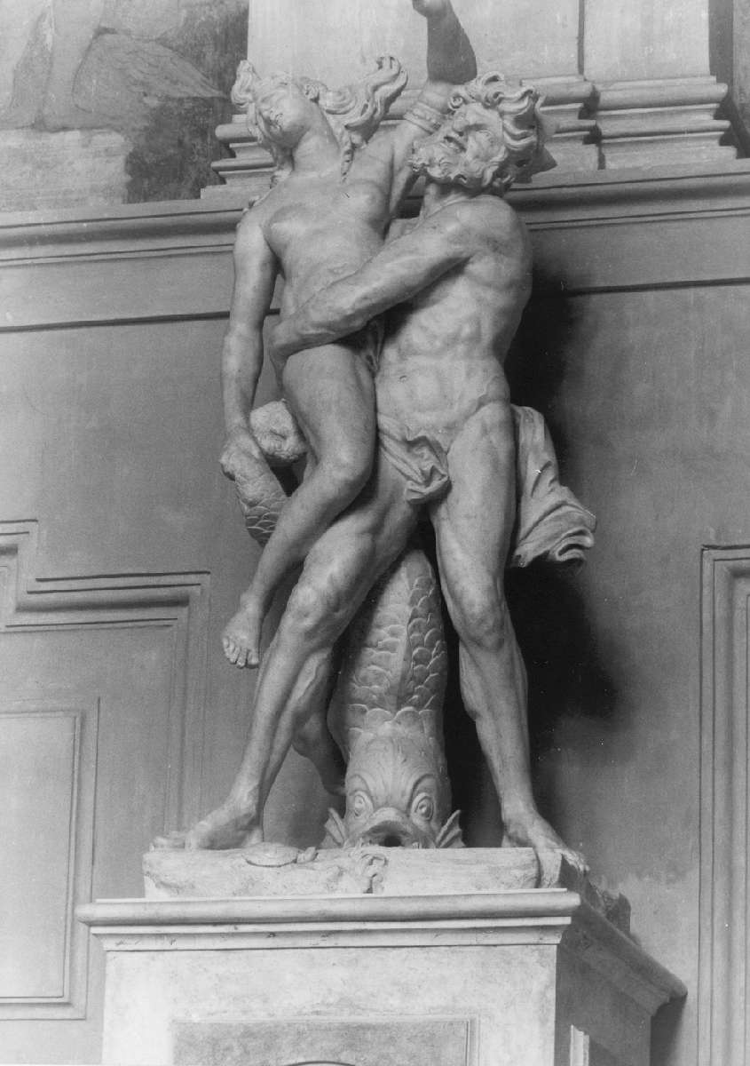 - NOTIZIE STORICO CRITICHE La scultura, eseguita tra il 1687 e il 1690, fu commissionata al carrarese Baratta per una fontana situata nel cortile della scala nobile del Palazzo Ducale di Sassuolo. Trasferita a Sassuolo nel 1756, il gruppo che tradisce la sua origine nel foro per l'acqua che zampillava dalla bocca del delfino, fu collocato dapprima nel parco. Andrea Baratta fu impegnato dagli Estensi anche nell'esecuzione di alcuni busti che restano comunque di qualità inferiore rispetto al " Nettuno e Anfitrite"