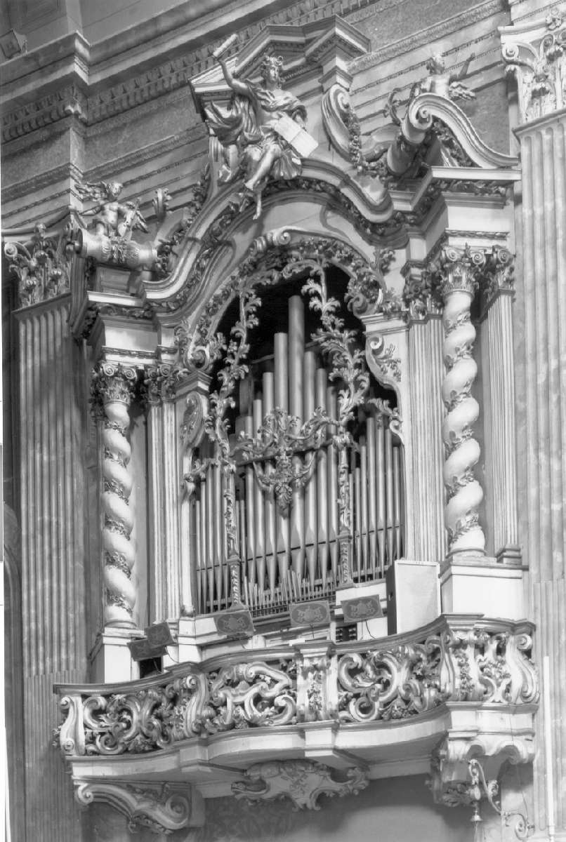 Balconata sospesa in legno intagliato con profilo mistilineo e decorazioni a volute vegetali. Sopra due alti basamenti si ergono due paraste composite e, al centro, una colonna tortile con capitello composito reggenti una cimasa a volute e fregi con ai lati due putti alati - a tuttotondo- che suonano il flauto e, al centro, un angelo che suona un liuto o una mandola