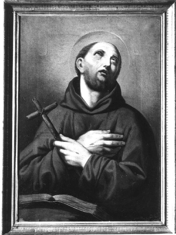 San Francesco è raffigurato a mezzo busto, con lo sguardo rapito verso ilcielo. Sulle mani, incrociate sul petto, sono visibili le stimmate. La mano sinistra impugna una semplice croce. Più in basso è visibile un libro aperto
