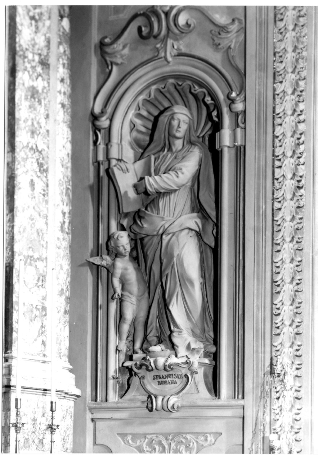 - NOTIZIE STORICO CRITICHE A partire dagli anni venti del Settecento, l' interno della Cattedrale, oggetto di radicali lavori iniziati nel 1712, viene arricchito di 36 sculture eseguite in gran parte dal ferrarese Andrea Ferreri e dai suoi allievi. I lavori, che da un esame delle fonti sembrano avere avuto un un arresto tra il 1738 e il 1743, si possono considerare conclusi nel 1746. Le statue, profondamente legate alle decorazioni plastiche delle nicchie e in stretta connessione con gli altari, furono commissionate da corporazioni e ordini monastici cittadini. Il B. Bernardo e la S. Francesca, ordinati dai Monaci Olivetani delle tre abbazie ferraresi, furono eseguiti probabilmente dal Ferreri tra il 1724 e il 1728. Secondo Ragghianti l' autore, omesso dalla fonti antiche, sarebbe da identificare con Pietro Turchi