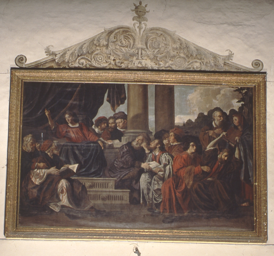 Gesù apostrofa i dottori nel tempio. A destra Maria e Giuseppe