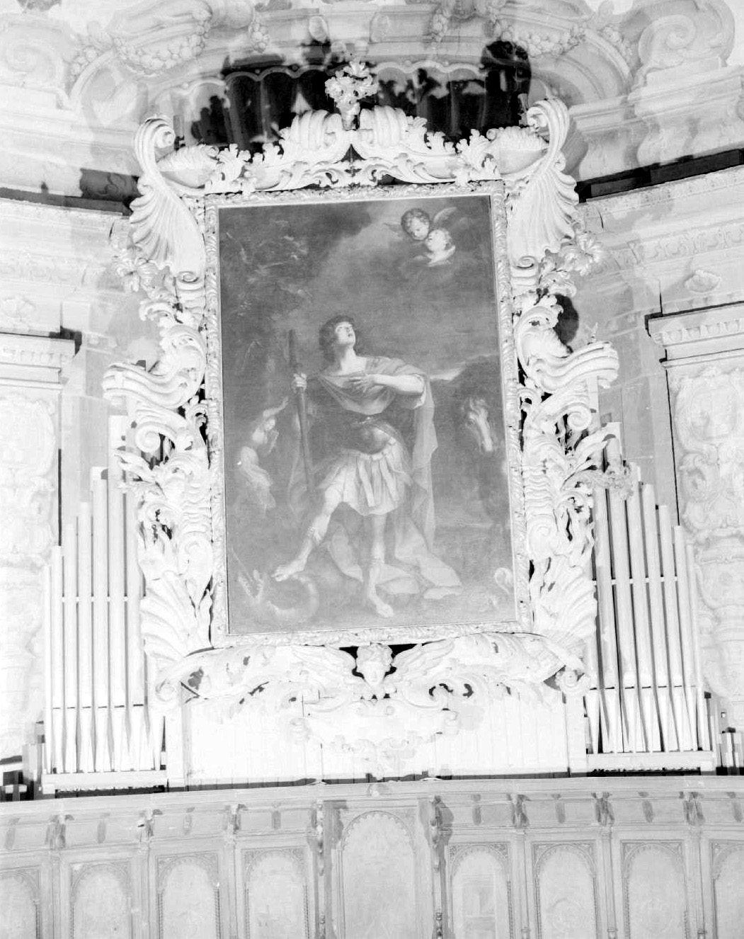 Ancona con pala d'altare caraterizzata una ricca decorazione a motivi vegetali, nella parte in basso al centro c'è una testina 'angelo tra le ali