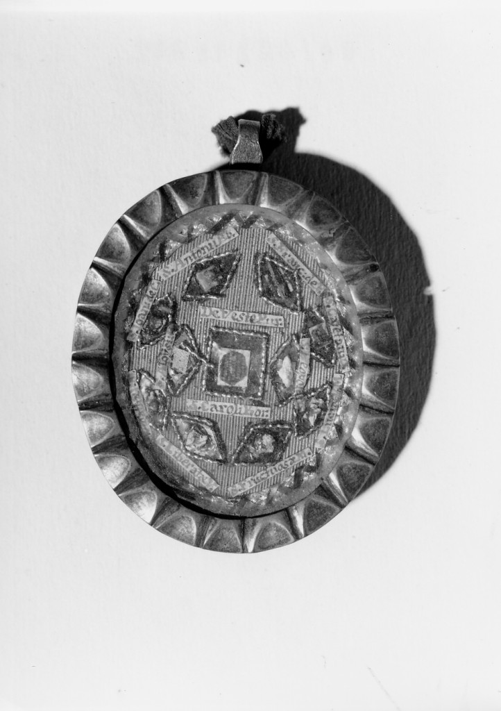 Reliquiario a medaglione in metallo, carta e tessuto