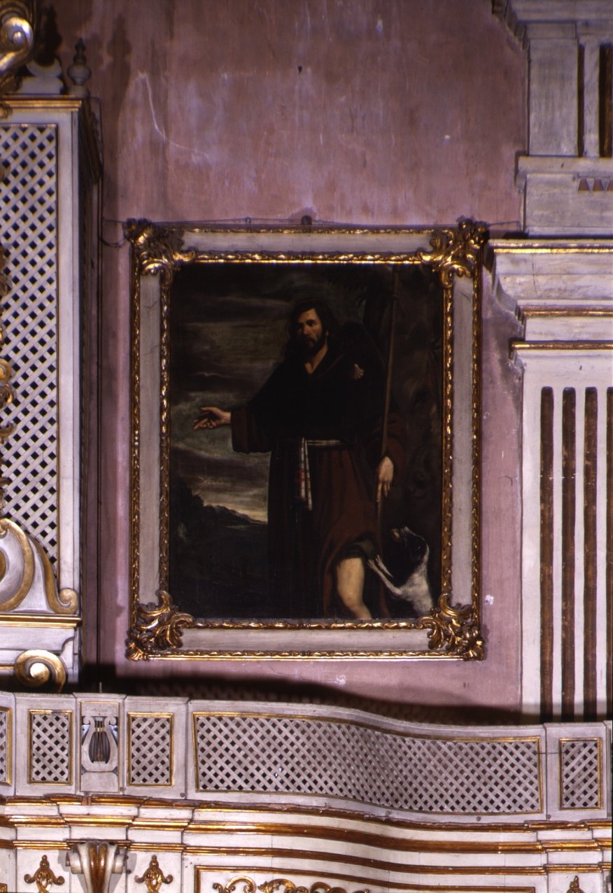 Il santo è in piedi, in un paesaggio, mentre indica la strada. Al suo fianco un cane