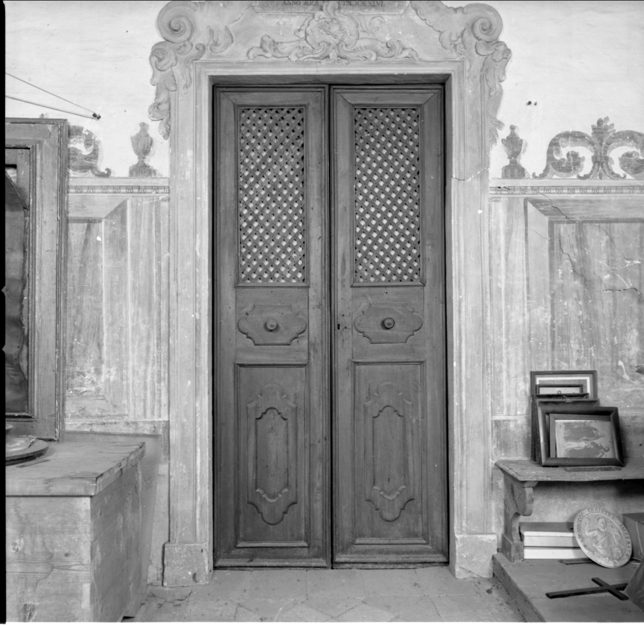 Porta a due battenti ciascuno dei quali ha due luci. Quella sottostante ha al centro una decorazione mistilinea a rilievo, al centro dei battenti due pomoli a cipolla, la luce in alto è costituita da una grata