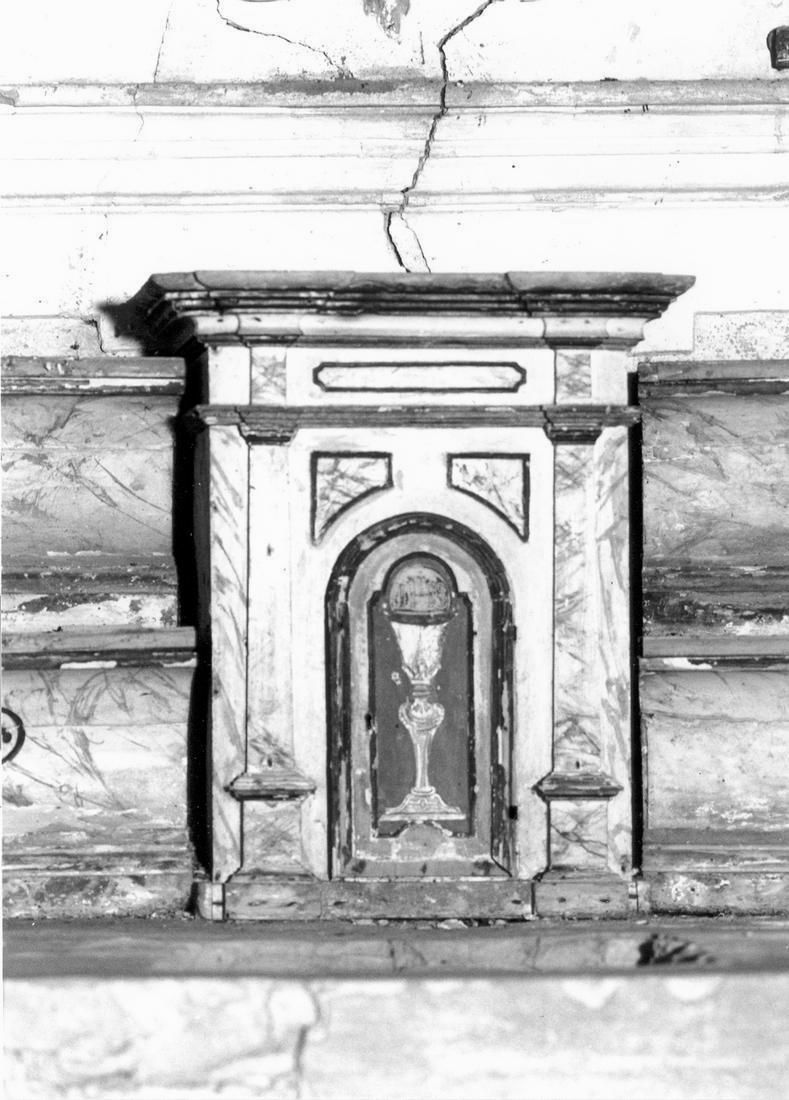Sportello affiancato da due paraste; al centro: calice eucaristico dipinto su fondo blu