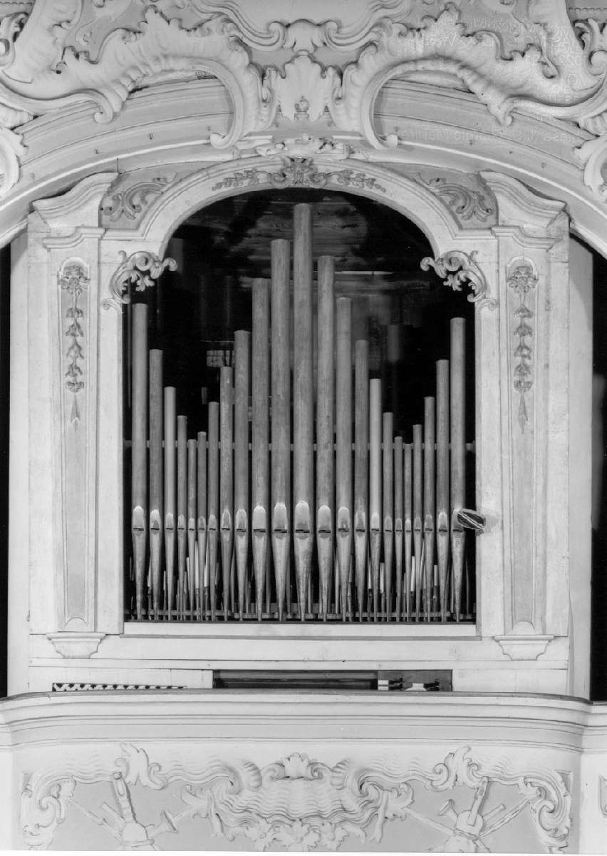 - NOTIZIE STORICO CRITICHE Cassa originale dell'organo settecentesco di Agostino Traeri, realizzata tra il 1761 e il 1762 da Giuseppe Casalgrandi. La cassa è stata mantenuta anche dopo la sostituzione dell'organo settecentesco con un nuovo, realizzato da Alessio Verati nel 1852. Ripetutamente ridipinta, la mostra è stata restituita alla cromia originale durante il restauro del 1982