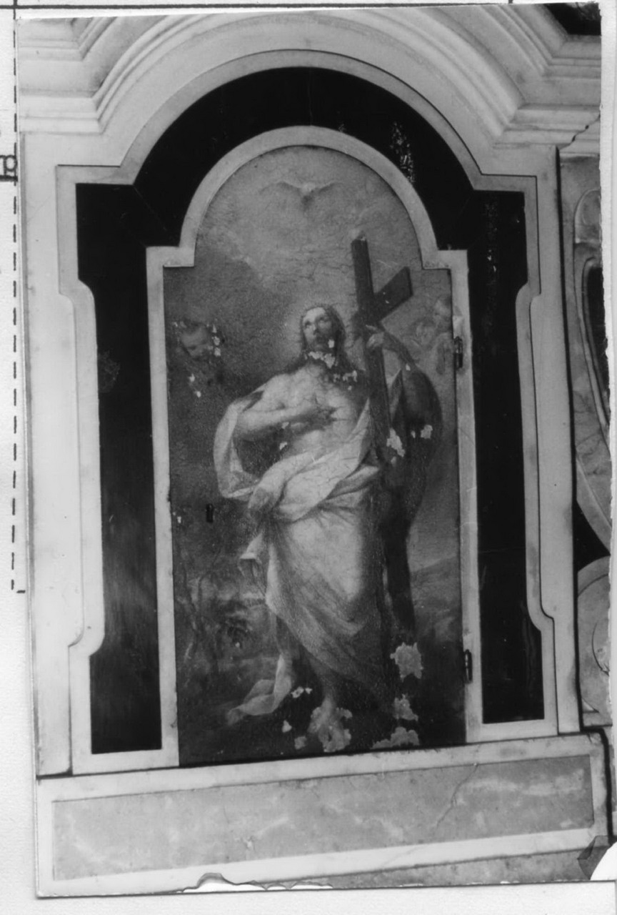 Dipinto di forma centinata, raffigurante Cristo avvolto in un drappo bianco che regge la Croce. Su di lui appare la colomba e intorno quattro testine d'angelo; dietro, sfondo di paesaggio