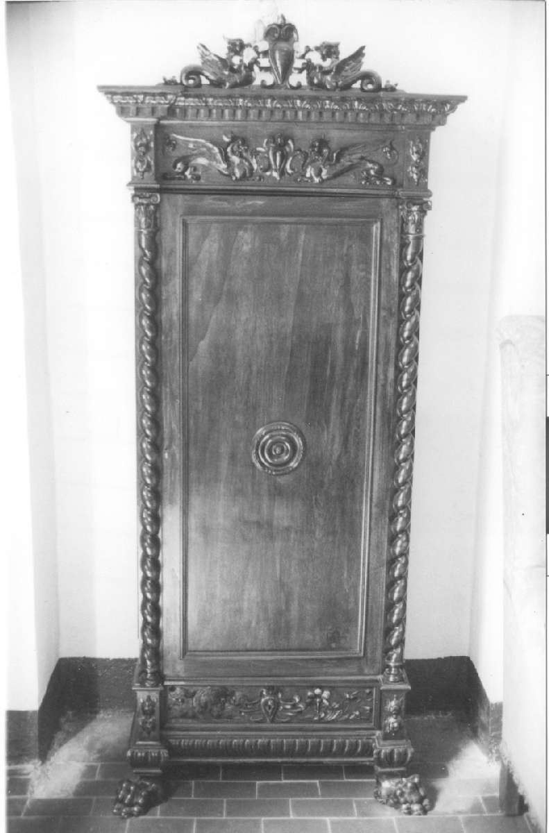 I piedi leonini sostengono un basamento intagliato a volute vegetali simili alla fascia superiore. Due colonnine a torciglione racchiudono lo sportello al cui centro è situato un motivo circolare. La cimasa superiore è formata da due draghi che sostengono lo scudo. Interno a cassetti di cartone color verde