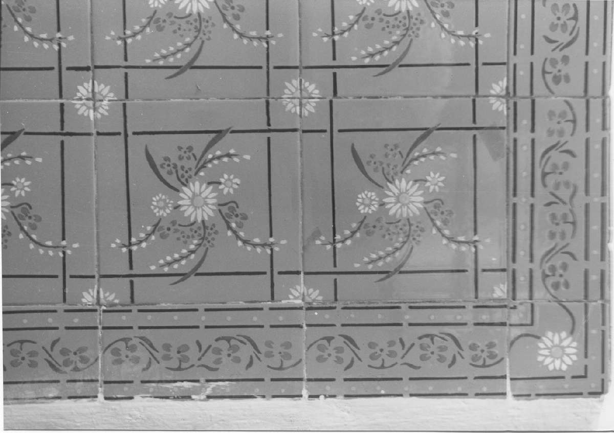 Pannello composto da 96 elememti. Su fondo grigio-azzurro con lineare profilatura bordeaux sono raggruppati in mazzolini margherite, viole e mughetti molto stilizzati. La cornice ha invece un motivo curvilineo con violette mentre la zoccolatura inferiore è marrone