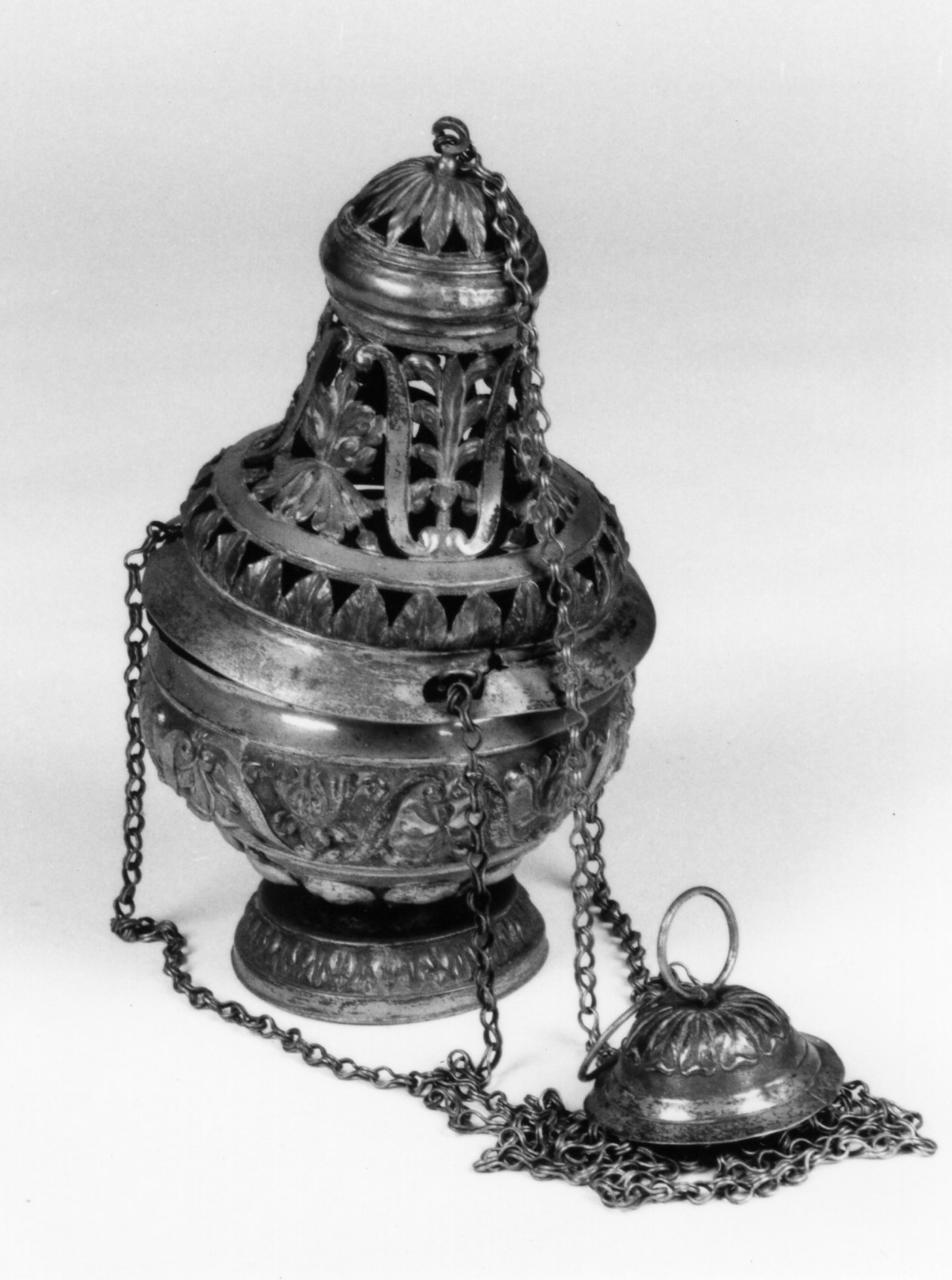 Turibolo in lamina d'argento sbalzato e cesellato a motivi d'acanto tra elementi nastriformi e foglie d'ulivo nella parte d'attacco con la base. Base con gola a palmette
