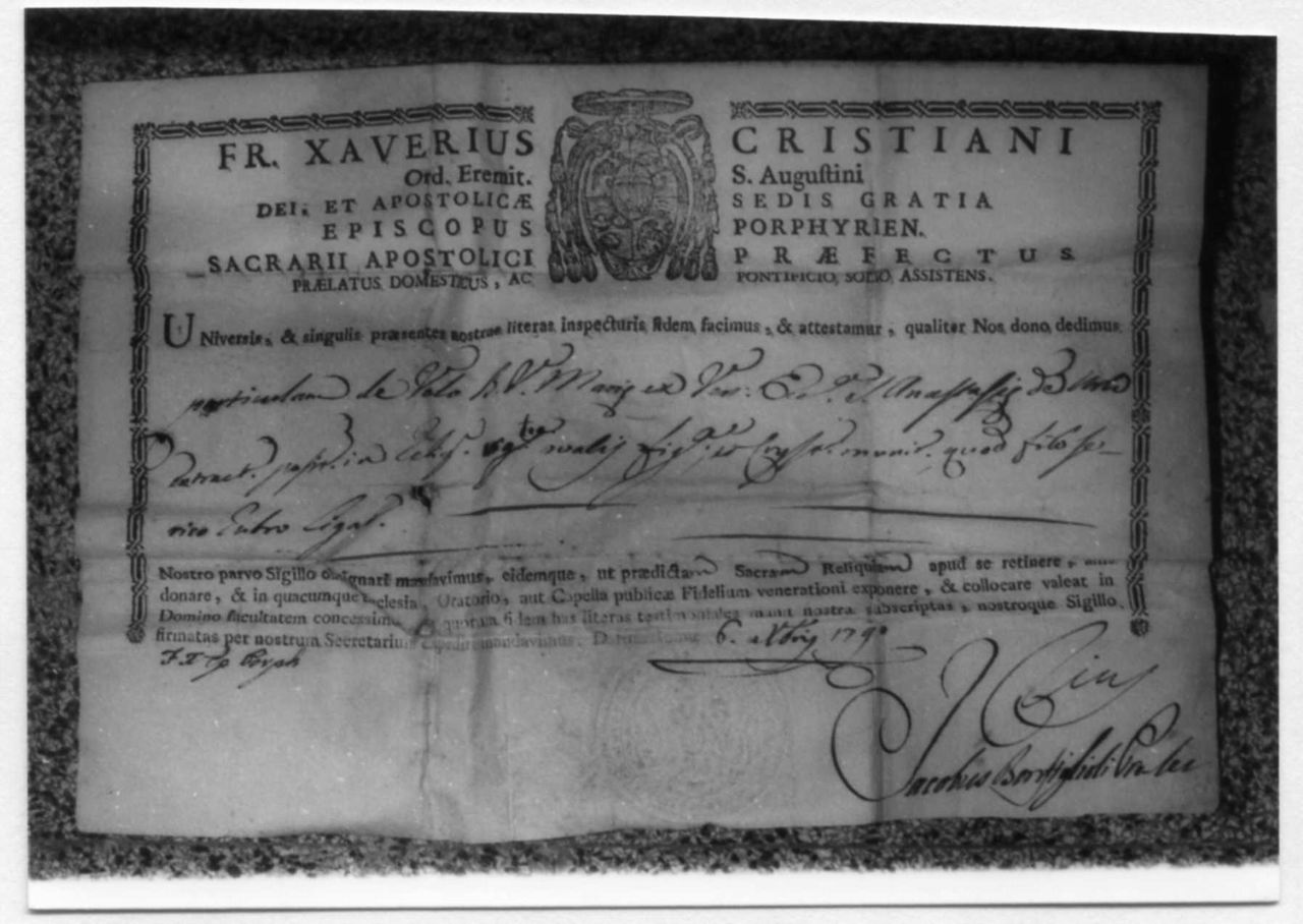 - NOTIZIE STORICO CRITICHE Oggetto devozionale di buona fattura. Contiene documenti del 1790 e del 1930 (autentiche di reliquie)