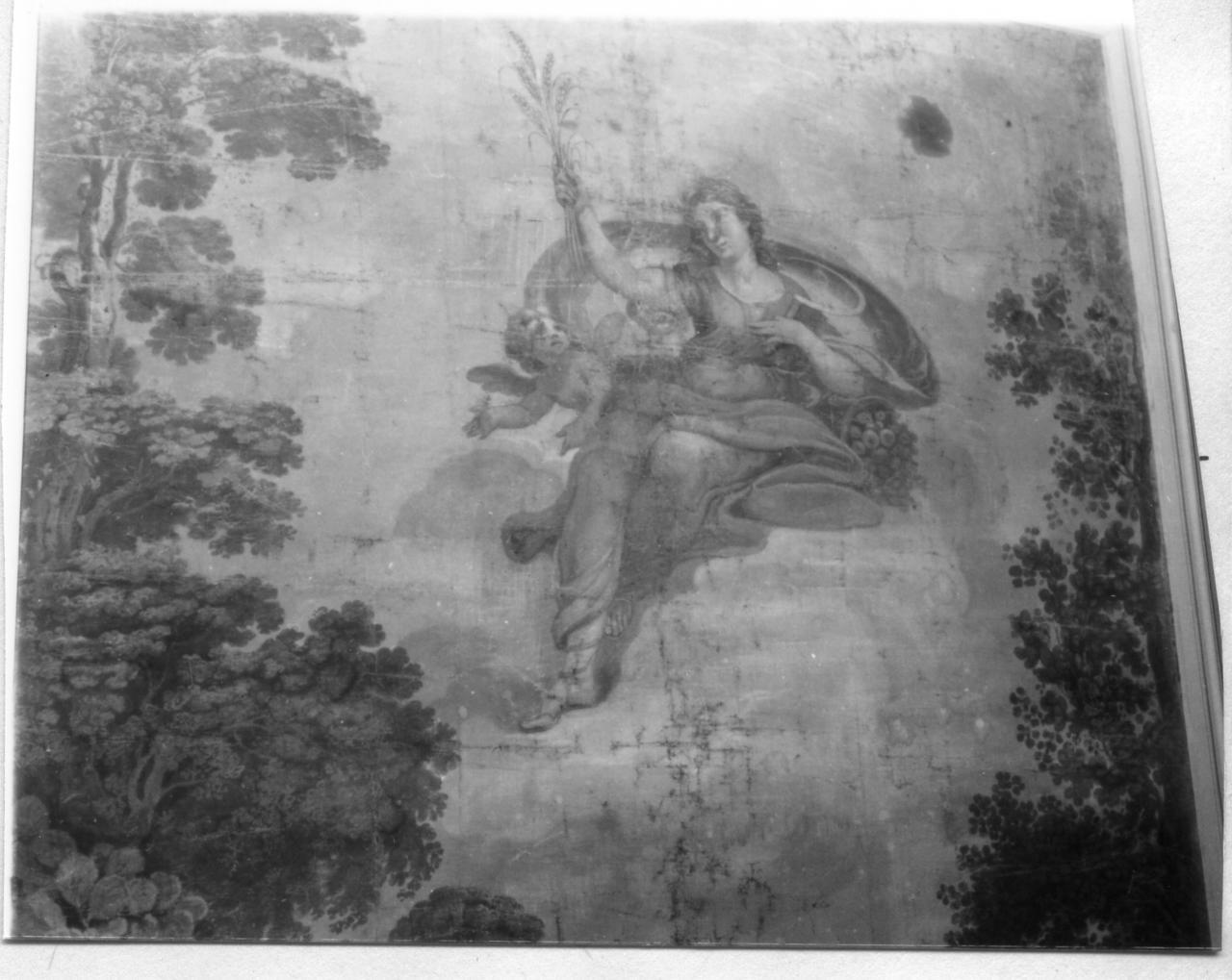 Paesaggio con quinte boscose a colori tenui e sulle nubi la figura femminile dell'Estate con cornucopia di frutta e spighe. Semplice cornice verniciata