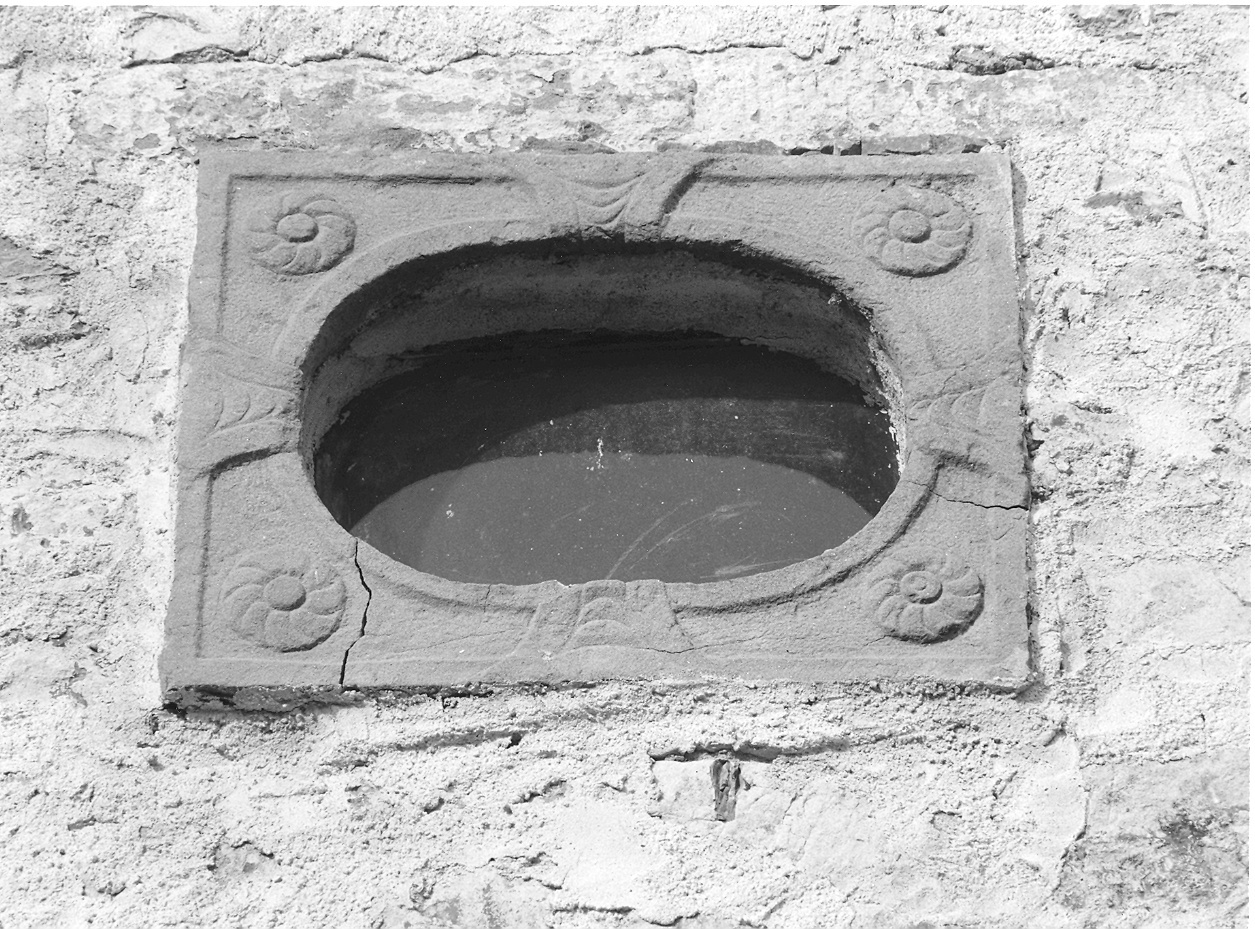 Coppia di oculi di forma rettangolare con luce ellittica, in arenaria finemente decorata da motivi stilizzati a rosette in corrispondenza dei quattro angoli. Innestati nel parato murario con grossolane stuccature a cemento