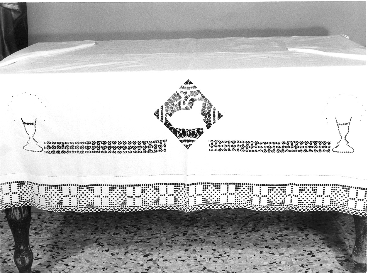 Tovaglia d'altare confezionata in tela di cotone bianca ricamata a punto intaglio: il disegno presenta un motivo romboidale centrale con Agnus Dei (incorniciato da barrette e rifinito a punto festone nei contorni), e due motivi laterali a calice (rifiniti all'interno a punto erba e festone) con raggiera costituita da una semicirconferenza di forellini a punto inglese, raccordati da due motivi orizzontali à jour ricamati a punto quadro. Il bordo in pizzo che guarnisce l'orlo, di produzione seriale, è di sostituzione