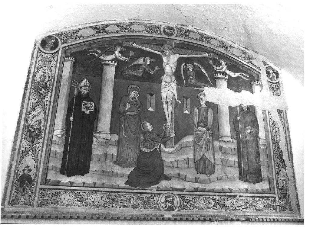 Al centro della scena è raffigurato il Cristo Crocifisso, attorniato da angeli recanti calici. Ai due lati stanno, in piedi, la Vergine e San Giovanni. Inginocchiata di fronte alla croce sta invece la Maddalena. A destra è invece visibile San Colombano, mentre a sinistra è San Benedetto con in mano il libro della regola. La scena è incorniciata da un motivo a racemi incrociati entro i quali trovano posto profeti con cartigli e, agli angolisuperiori, due tondi con l'angelo nunziante e la Vergine. Lo sfondo è occupato dalle mura stilizzate di una città con torrioni circolari