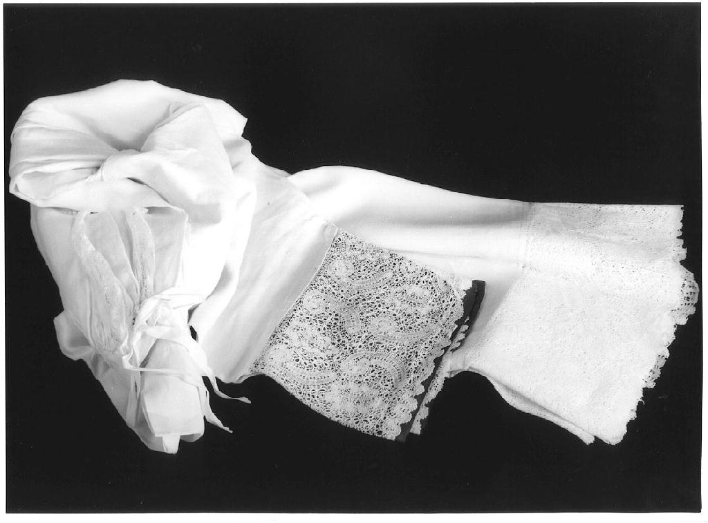 Sul collo e sui polsi del camice, un bordo in pizzo con un motivo continuo di piccoli occhielli entro i quali sono poste ampie volute ansate a punto pieno