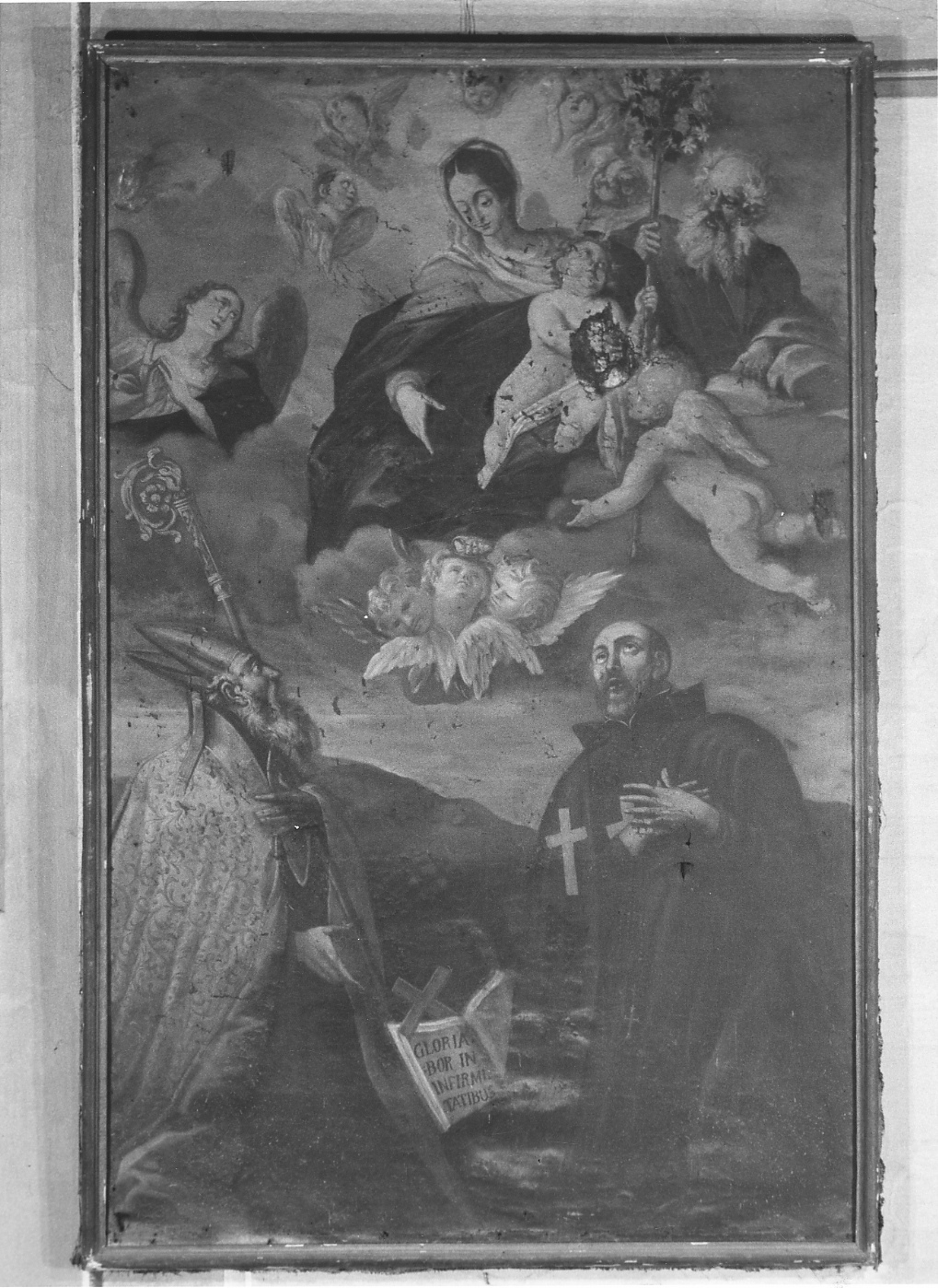 Personaggi: Madonna; Gesù Bambino; San Giuseppe; Santo Vescovo; San Camillo de Lellis. Figure: angelo; cherubi. Attributi: (Santo Vescovo) libro. Abbigliamento: (Santo Vescovo) abbigliamento vescovile. Abbigliamento: (San Camillo de Lellis) abito ordine dei Chierici Regolari Ministri degli infermi. Attributi: (San Giuseppe) verga fiorita. Fenomeni divini: nubi; luce