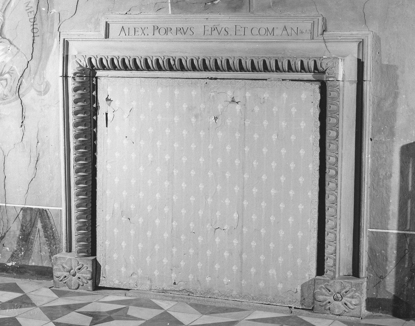 - NOTIZIE STORICO CRITICHE L'iscrizione ci attesta che questo camino venne eseguito nel 1652, durante il Vescovato di Alessandro Porro (1650-1660). Seppure i moduli decorativi sono abbastanza generici e non si distaccano molto dal gusto ornamentale del primo '600, pure questo camino possiede una certa sobria eleganza. E' interessante notare come l'iscrizione di questo camino venga ripresa testualmente al'interno di uno dei medaglioni affrescati dal porro tra il 1724 ed il 1725