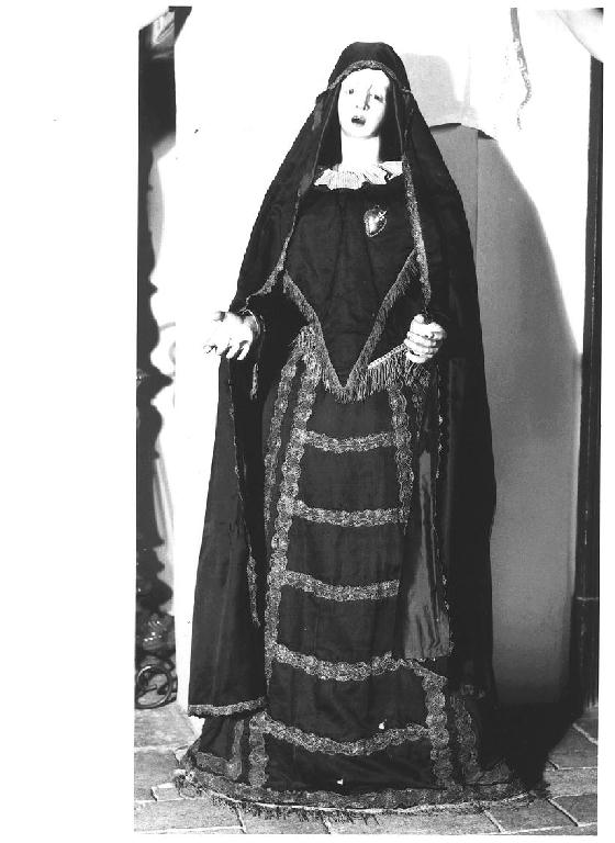 - NOTIZIE STORICO CRITICHE Nell'inventario di S. Liberati del 1831 si legge: "un vestito per la statua di S. Maria Maddalena de Pazzi, di lana violaceo, camicia e velo per lastessa". Potrebbe trattarsi del "busto di S. M. Maddalena de Pazzi, il cuore e due mani della stessa santa" citato nell'inventario di S. Bortini (1831-1842). Lo stesso inventario annovera anche: "una camicia per S.M. Maddalena di tela buona e finissima. Una veste per la stessa santa di saja violacea in buono stato con abitino della stessa saja". Si trova anche la notizia di un "piedistallo dipinto di verde per portare S. Maria Maddalena e S. Rocco". L'opera è attualmente utilizzata come Madonna Addolorata